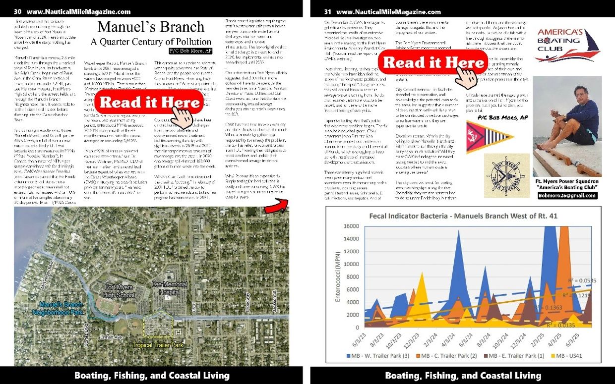 And dumping is exactly what it does. Manuel’s Branch, and it’s birth partner Billy’s Creek, are full of human fecal waste bacteria. Really full. Fecal bacteria levels are measured in MPNs (“Most Probable Number”). In Canada, the number of MPN’s per sample considered safe for drinking is zero, CWK Waterkeeper Emeritus John Cassani explained that the Florida criterium for E. coli states that a monthly geometric mean shall not exceed 126, nor exceed 410 on 10% or more of five samples taken in any 30-day period. In an 11/19/25 Calusa Waterkeeper Report, Manuel’s Branch levels since 2021 have averaged a stunning 2,579 MPNs; at times the waters have ranged between 4000 and 16000 MPN’s.