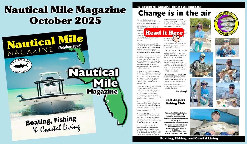 I invite the readers of the Nautical Mile to attend a meeting of the Reel Anglers Fishing club on the second Wednesday of the month at the Power Squadron Building downtown Cape Coral.