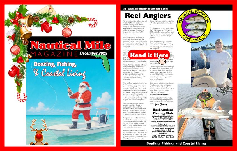 Men, women and children are all invited. The December meeting will be our holiday celebration. Our regular meetings will resume on January 14th at 6 PM at the Cape Coral Power Squadron. Our website is reelanglesfishingclub.com.