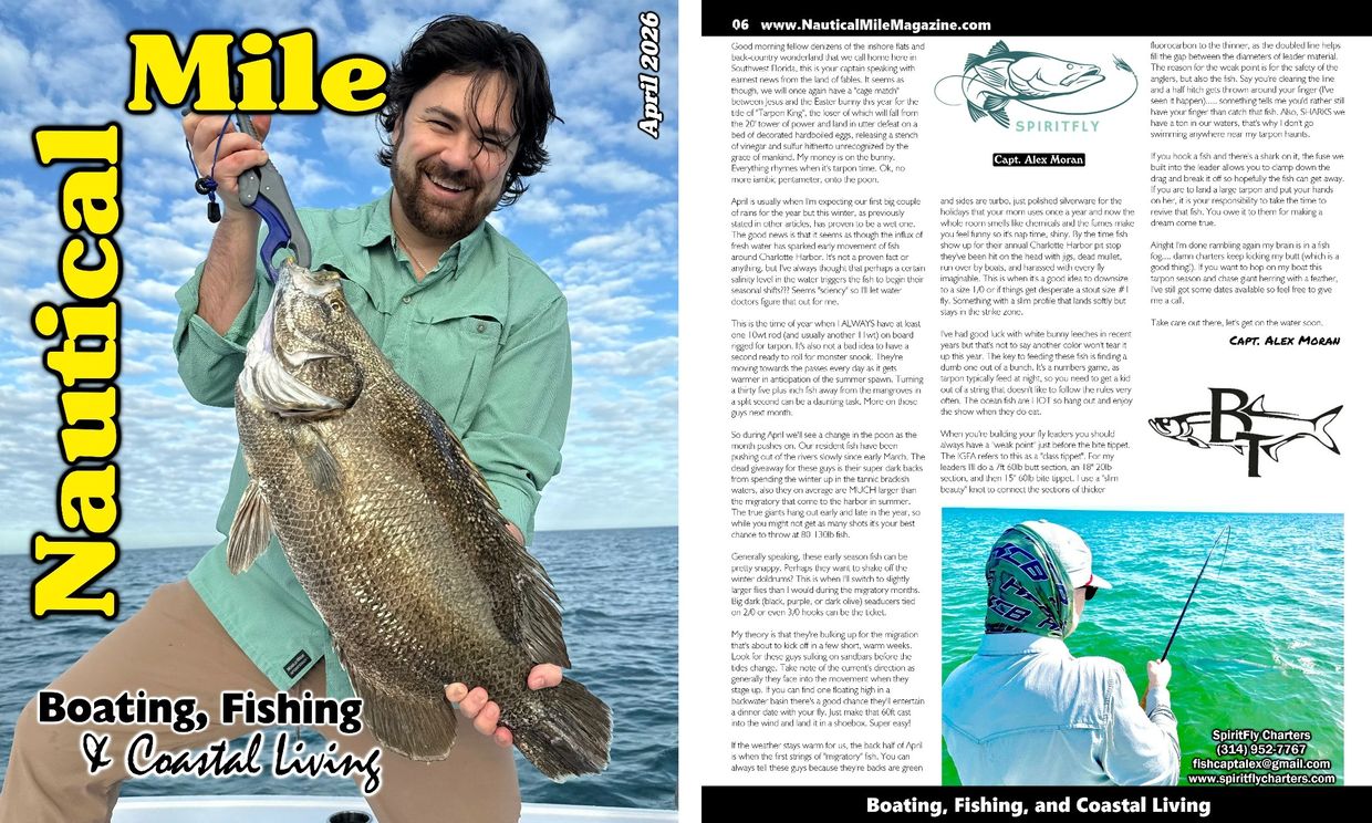 This is the time of year when I ALWAYS have at least one 10wt rod (and usually another 11wt) on board rigged for tarpon. It's also not a bad idea to have a second ready to roll for monster snook. They're moving towards the passes every day as it gets warmer in anticipation of the summer spawn. Turning a thirty five plus inch fish away from the mangroves in a split second can be a daunting task. More on those guys next month.
